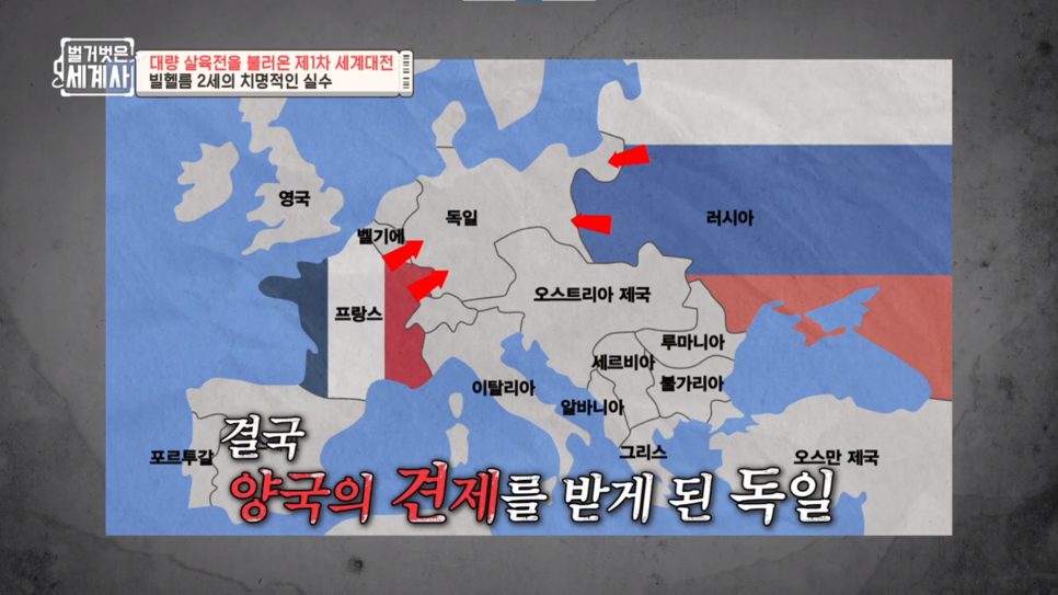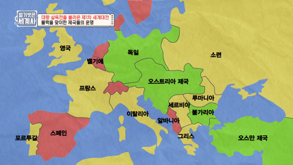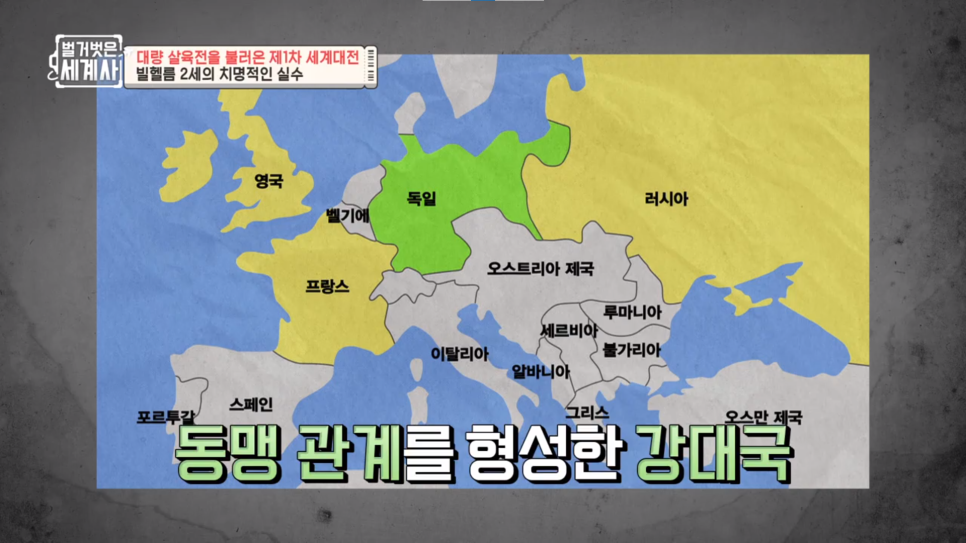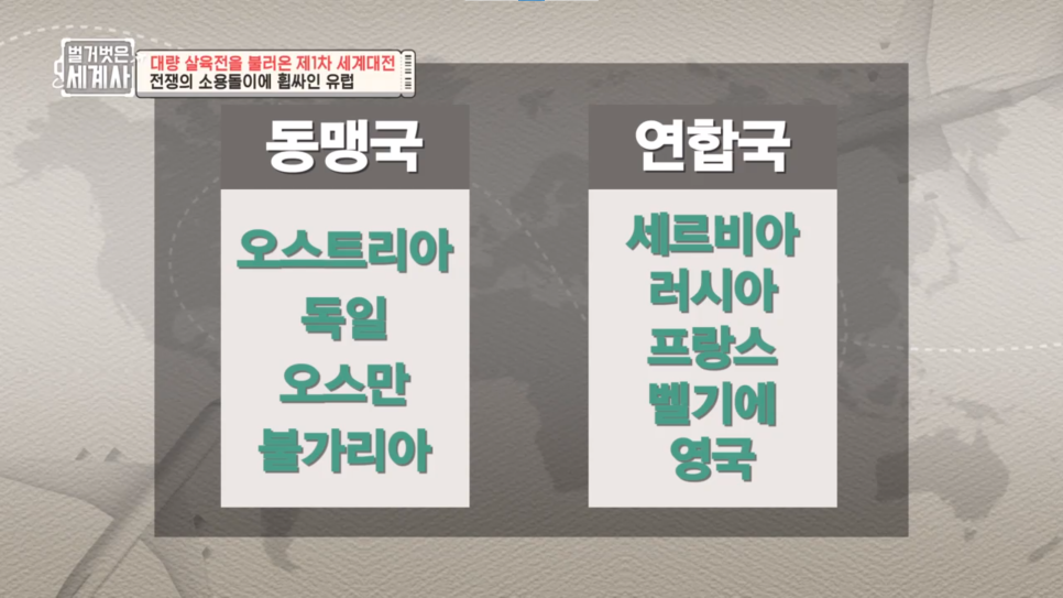 연합국(대영제국, 프랑스, 러시아 제국) VS 동맹국(독일제국, 오스트리아-헝가리 제국)