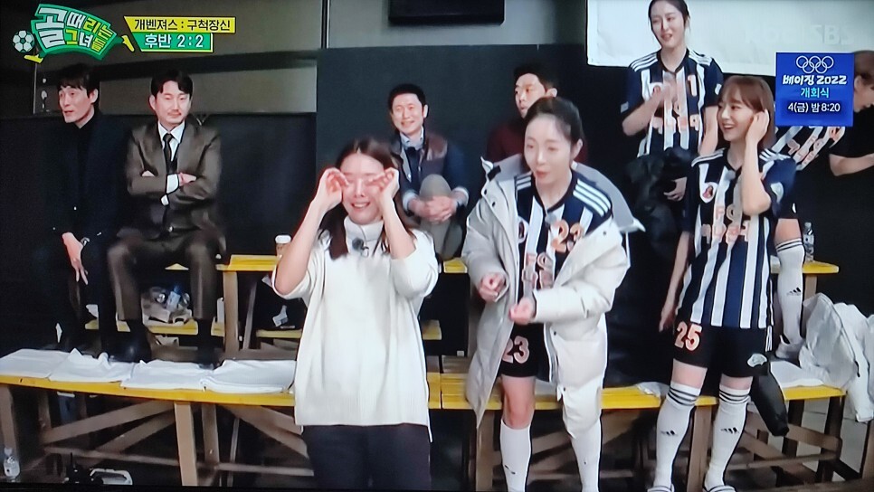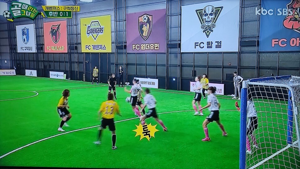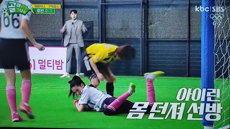 김진경이 킥 인하고 조혜련 골키퍼가 볼을 쳐냈는데