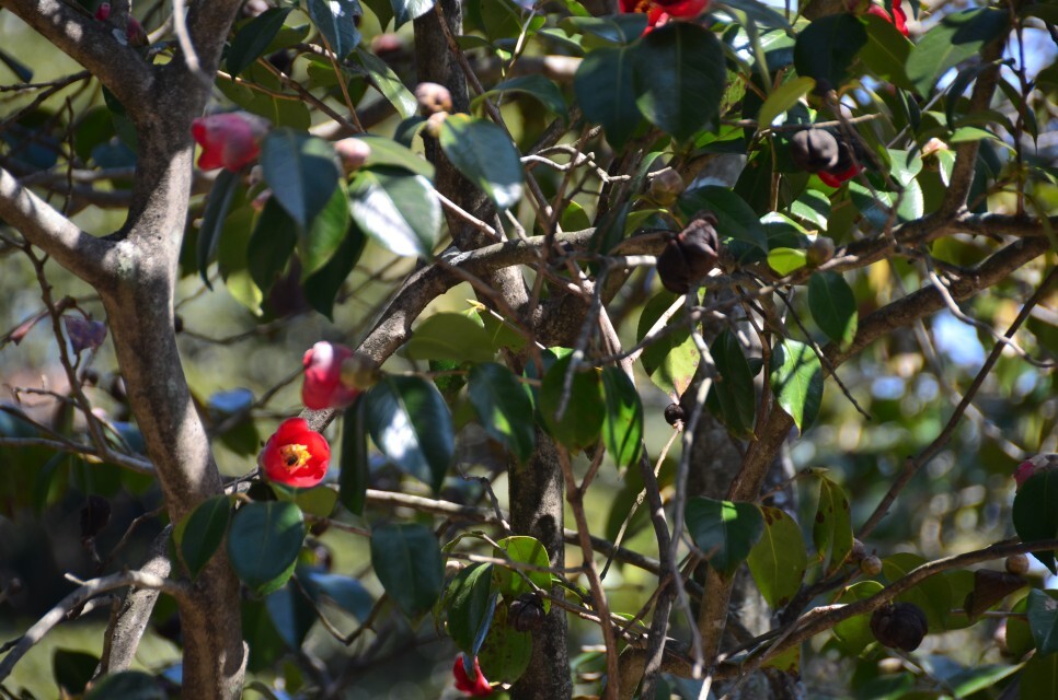 조금 더 길을 따라 올라가니 동백나무가 보이고 동백꽃봉우리가 펼쳐지고 있습니다.