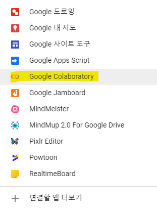 2. 새로만들기 - 더보기 - 연결한 앱 'Colaboratory' 검색