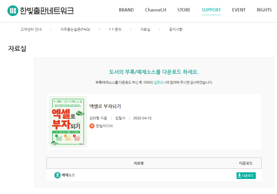 홈페이지에서 책을 검색하면 이렇게 예제소스를 다운 받을 수 있다.