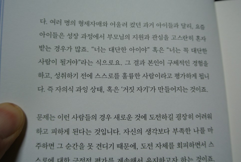 요즘 아이들을 부모님의 관심을 혼자 받는 경우가 많다고 해요. 그러다보니 "너는 대단한 아이야", "너는 꼭 대단한 사람이 될거야"라는 식으로 경험에서 우려나오는 것이 아니라 스스로를 훌륭한 사람이라고 평가하게 된다고 해요.