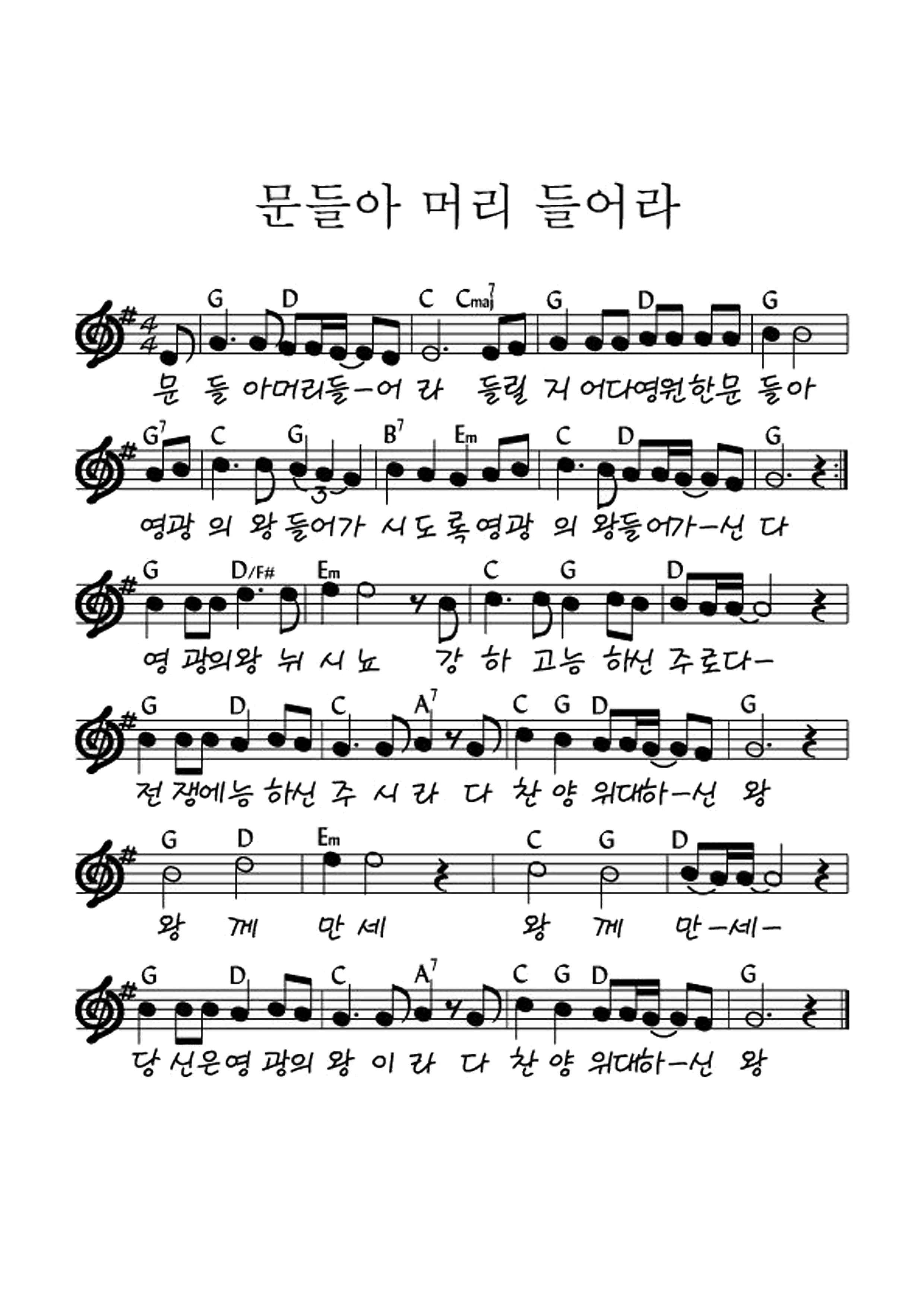 7 문들아 너희 머리를 들지어다 영원한 문들아 들릴지어다 영광의 왕이 들어가시리로다