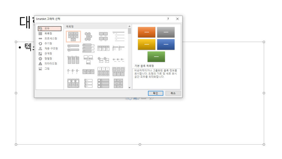 내용쪽에 SmartArt 그래픽 삽입을 클릭합니다.