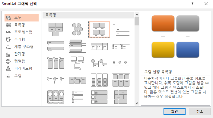 그림 설명 목록형으로 위쪽 도형에 그림을 넣을 수 있고 짧은 텍스트도 입력이 가능합니다.