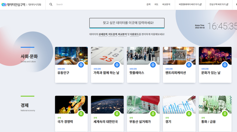 데이터코리아는 과학기술정보통신부와 한국데이터진흥원 등이 만든 데이터 시각화 서비스를 통해 자료를 찾아 사용할 수 있도록 꾸며져 있습니다.