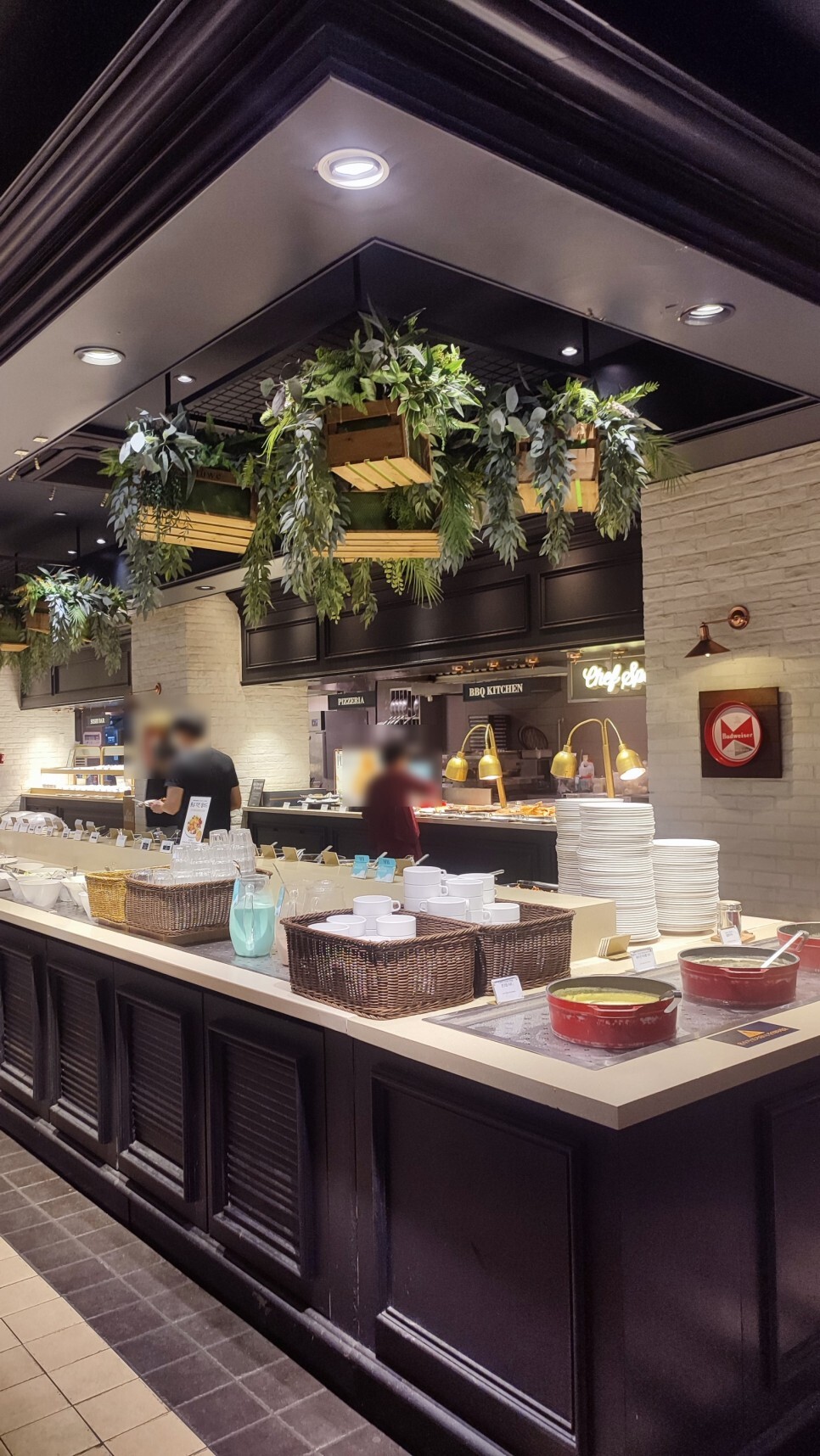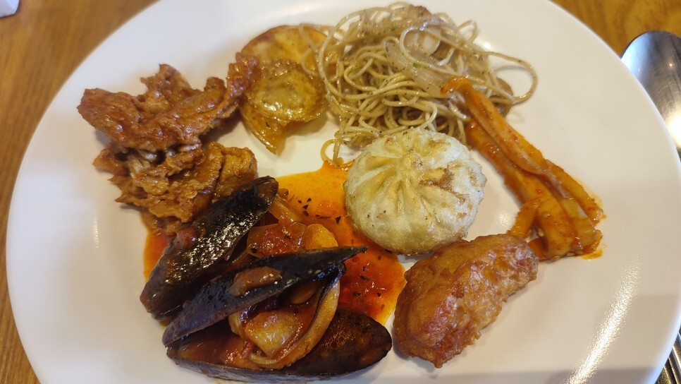 뷔페라 일회용 손장갑을 사용해야 하고, 마스크 착용해서 음식 가져와야 한다.
