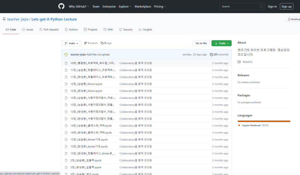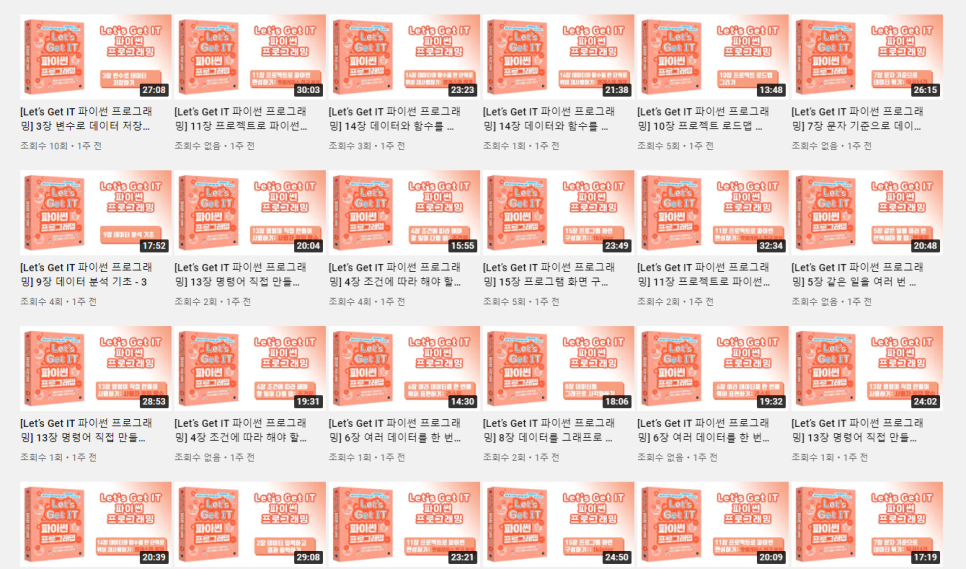 유튜부 강의가 모두 올려져 있어서 초보 파이썬 프로그램 공부하시는 분들에게 아주 유익합니다.