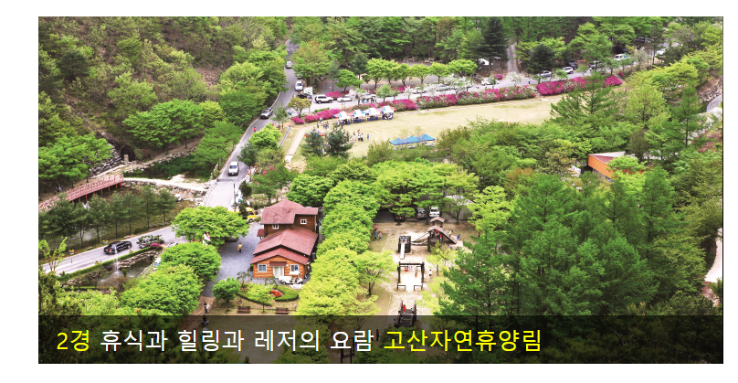2경 고산자연휴양림 - 자연속에서 휴식을 취할 수 있는 가족휴양지, 레포츠 시설도 운영하고 있어 휴식과 레저 모두 충족할 수 있는 곳인데요. 카라반, 휴양관, 숲속의 집에서 숙박이 가능하다고 하니 가족 여행 떠나실 분들은 참고하시면 좋겠네요.