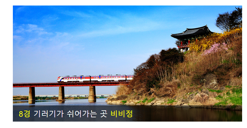 8경 비비정&비비정예술열차 - 4량의 새마을호를 이용해서 비비정의 랜드마크를 만든 곳인데요. 실제로 가서 보면 참 멋진 곳이란 사실을 알게 됩니다. 경치가 참 좋은 곳입니다.