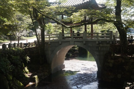 사찰 입구에서 저수지 방향을 바라보면서 위치한 교각에서 바라보는 풍경입니다.