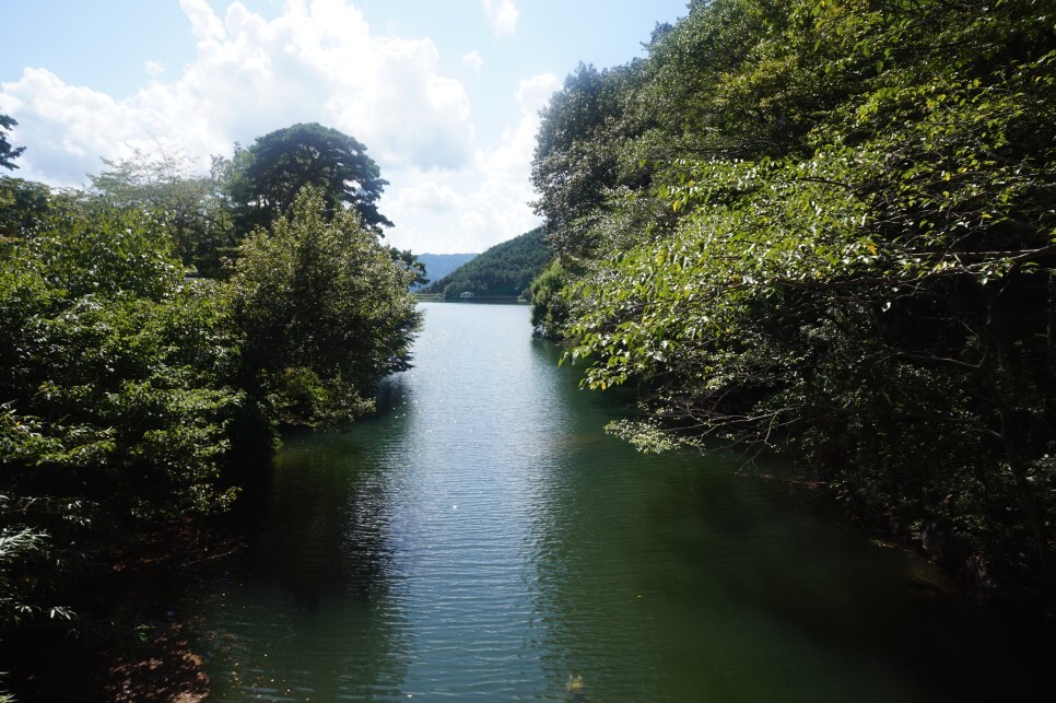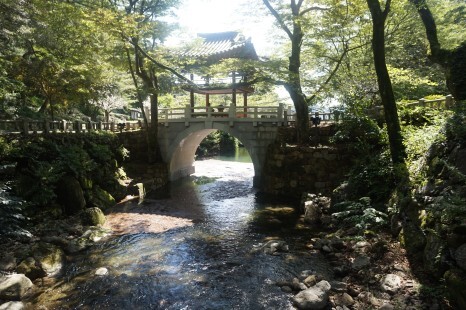 사찰 입구에서 저수지 방향을 바라보면서 위치한 교각에서 바라보는 풍경입니다.