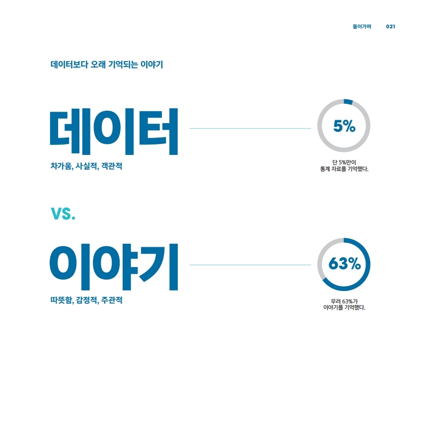 그런데 이 데이터에 이야기를 붙이면 63%가 기억한다고 하니 숫자를 이야기로 바꾸는 기술을 익혀야 겠죠.