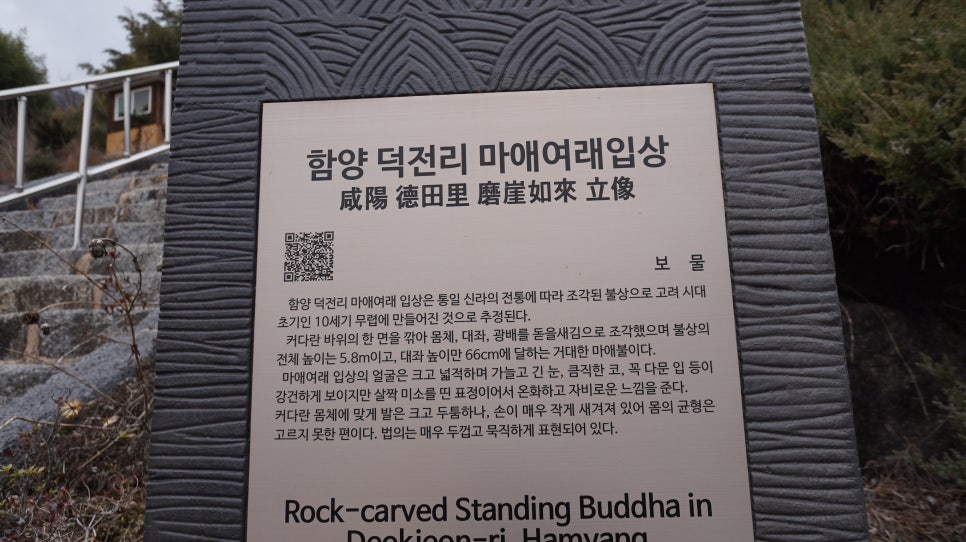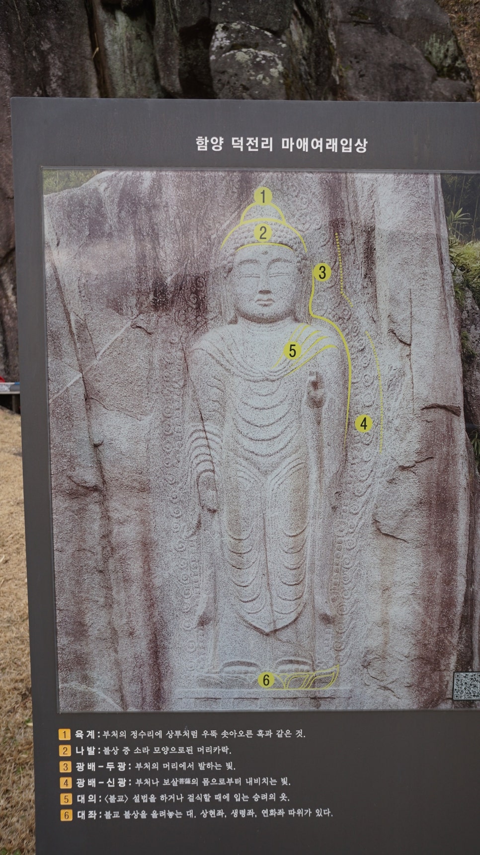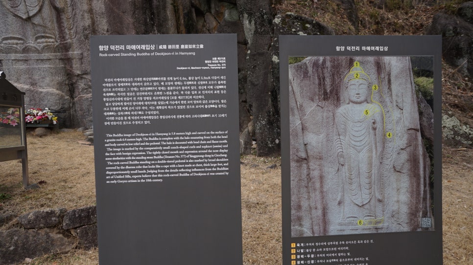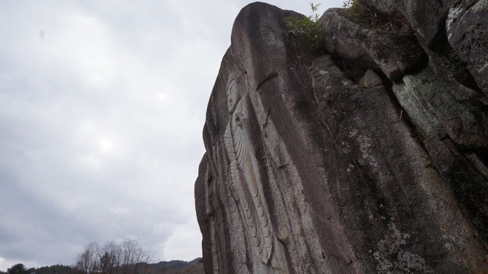 마애여래 입상의 얼굴은 크고 넓적하며 가늘고 긴 눈, 큼직한 코, 꼭 다움 입 등이 강건하게 보이지만 살짝 미소를 띤 표정이어서 온화하고 자비로운 느낌을 준다고 하네요.