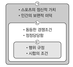 16. 그림 은 스포츠윤리규범의 구조이다 ㉠ ~ ㉢에 해당하는 용어가 바르게 연결된 것은?
