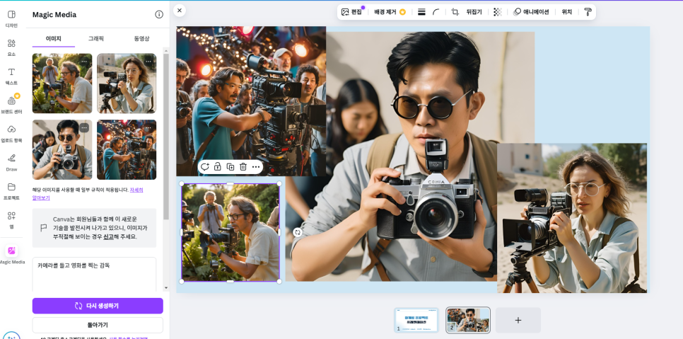 캔바에서 제공하는 앱을 사용하면 포토샵을 잘 다룰 수 있는 디자이너가 작업할 수 있는 정도의 작업물을 캔바를 통해 쉽게 수정할 수 있네요.