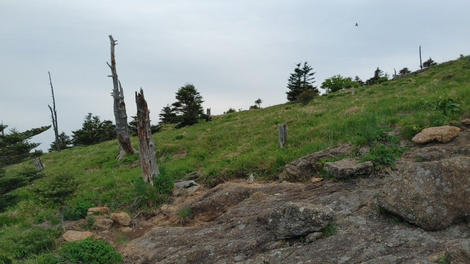 그래서 대낮에도 어두울 정도로 푸르름을 간직했었는데 도벌꾼들이 도벌 흔적을 없애려 불을 질렀고, 그 불이 제석봉을 태워 지금처럼 나무들의 공동묘지가 되었다고 하네요.