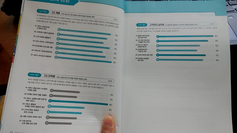 책은 CS 개론, CS 전략론, 고객 관리 실무론에 대한 이론을 3개 파트로 설명해 주고요.