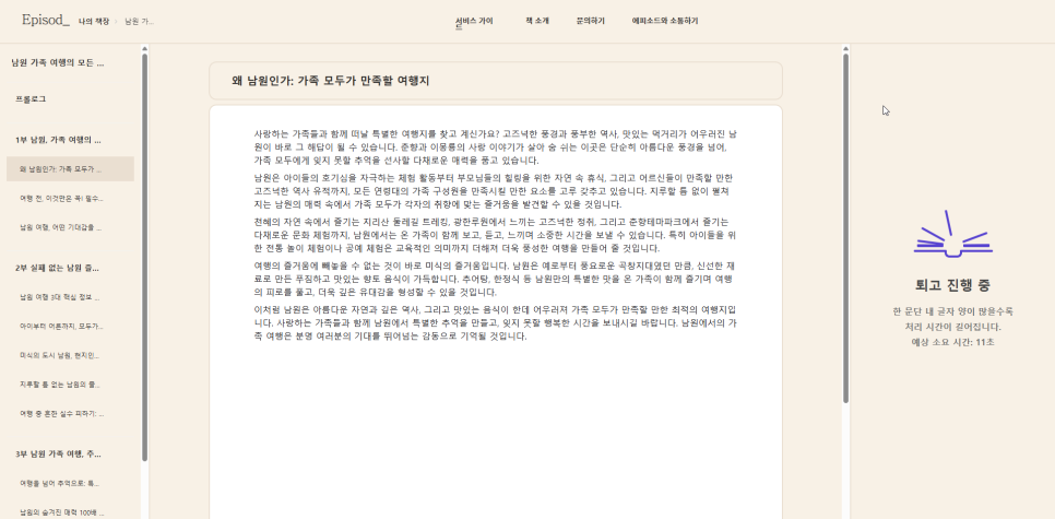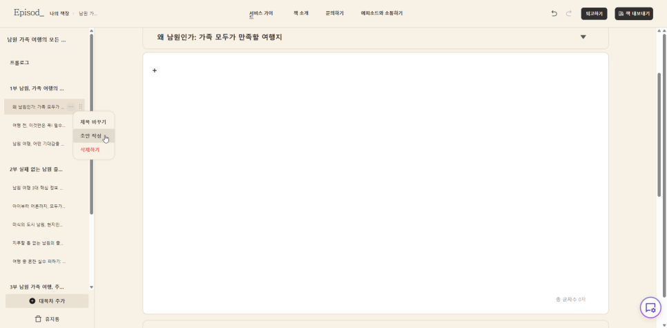 에피소드 생성형 인공지능 서비스를 이용하면 좀 더 쉽게, 사실 아주 편하게 목차를 잡을 수 있습니다.