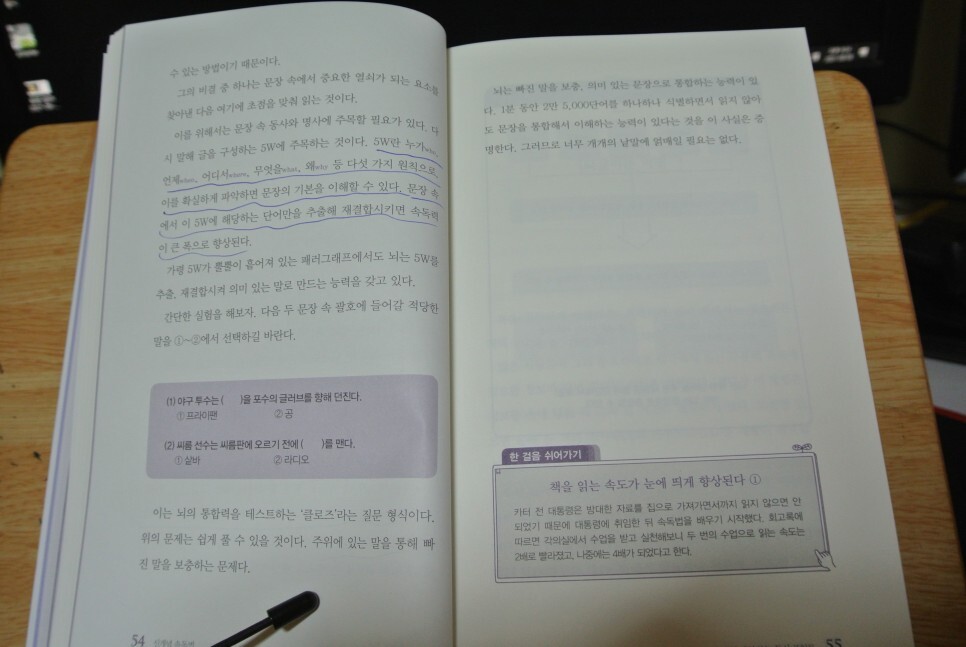 책을 읽을 때 중요한 것이 이해력을 유지하면서 책 읽는 속도를 높이는 것이 중요한데 이를 5W 속독법이라 부른다.