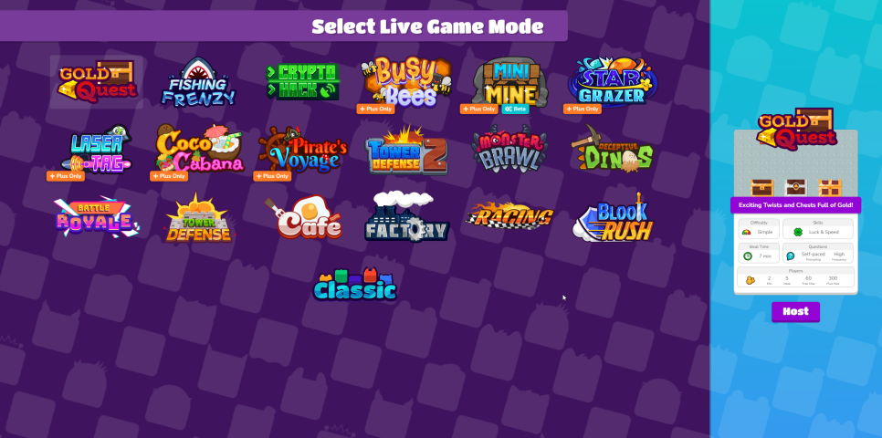 Host Game은 실시간 퀴즈를 바로 사용해서 게임을 진행할 수 있습니다.