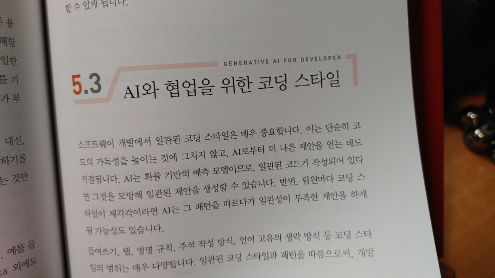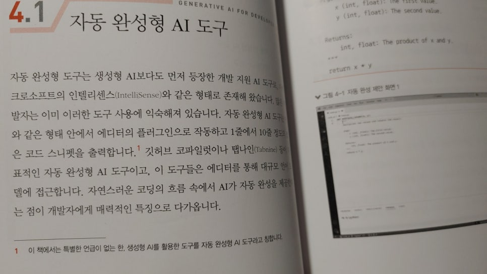 오늘 제가 읽은 개발자를 위한 생성형 AI 활용 가이드는 인공지능을 활용하여 프로그램 코드 작성하는 방법을 배울 수 있습니다.