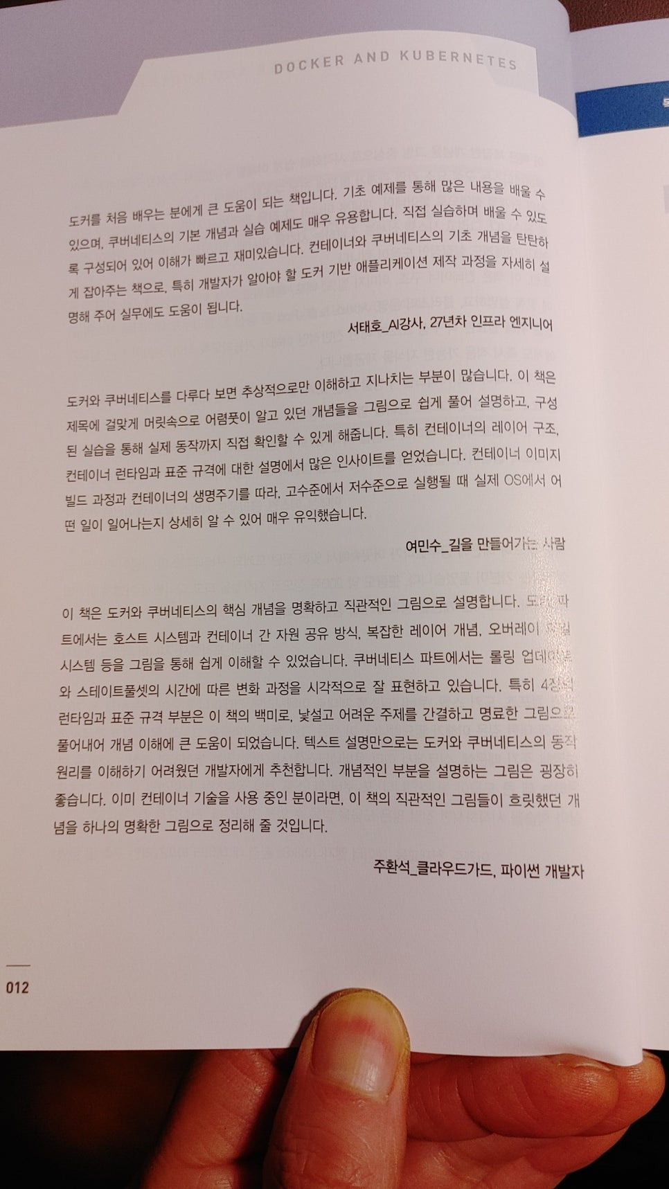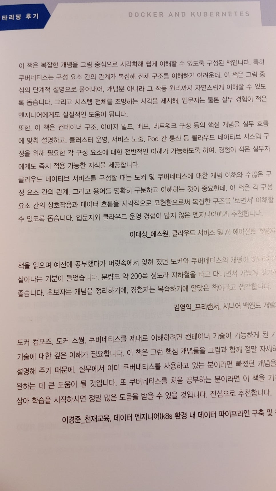 "잊혀졌던 도커와 쿠버네티스의 개념이 하나씩 되살아나는 기분이 들었습니다. 초보자는 개념 정리에, 경험자는 복습하기에 알맞은 책입니다." - 김영익 (프리랜서, 시니어 백엔드 개발자)