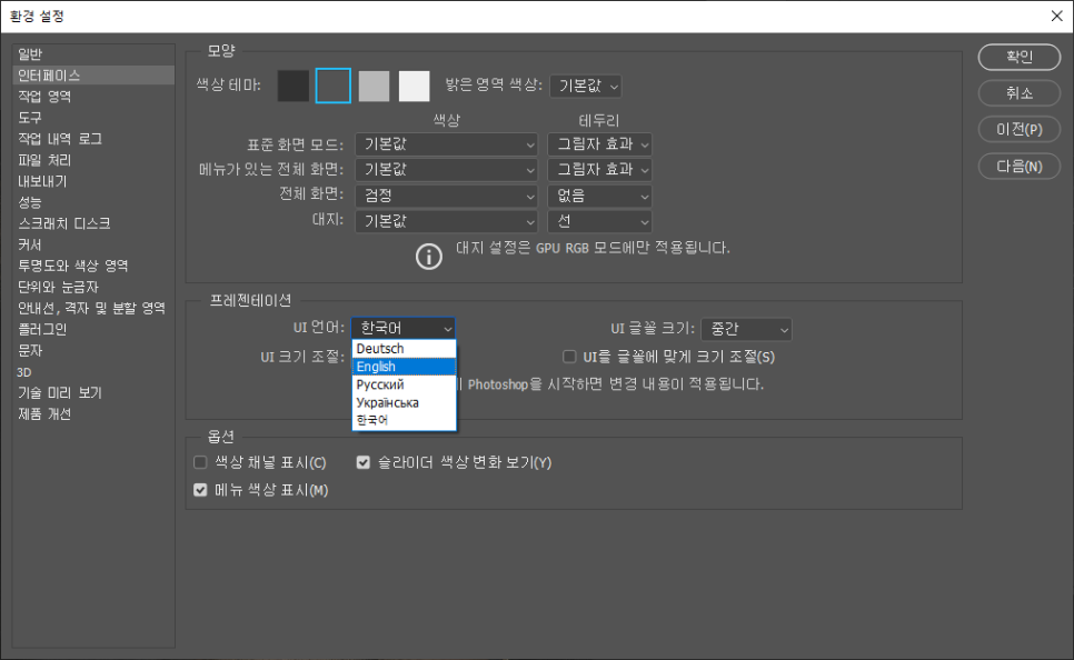 이렇게 변경한 다음에 프로그램을 종료했다가 다시 실행하면 영어 버전이 됩니다.