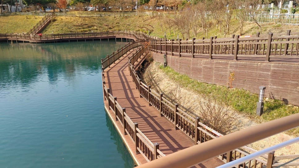 호수 둘레로 산책길이 아주 잘 조성되어 있는데, 특히 호수 안쪽을 가로지르는 데크길이 인상적이에요.