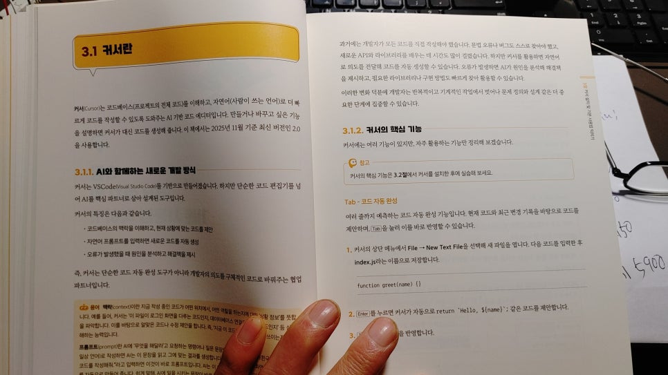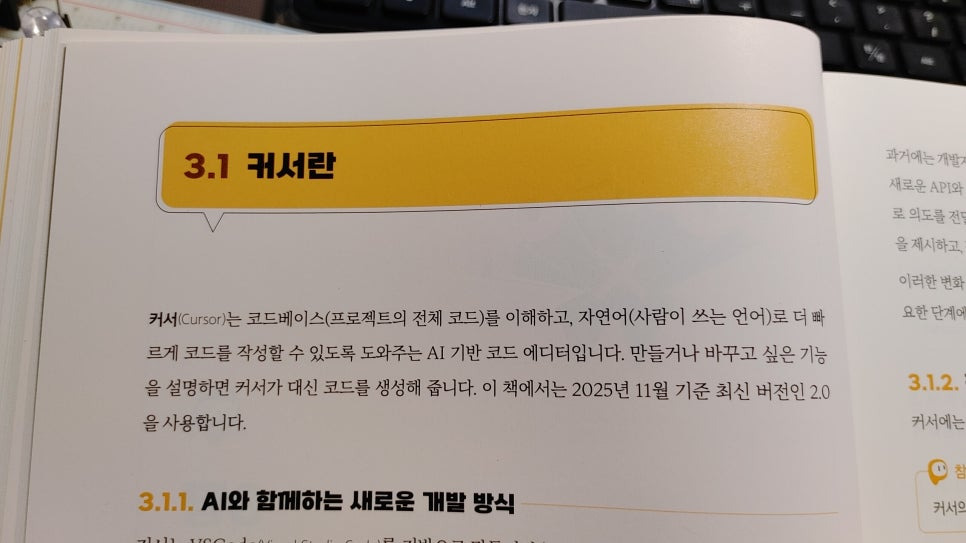 이 책에서는 'Cursor(커서)'라는 차세대 코드 편집기를 사용합니다. 겉모습은 개발자들이 많이 쓰는 VS Code와 거의 같지만, 핵심은 "AI가 코드 안으로 직접 들어와 있다"는 점입니다.