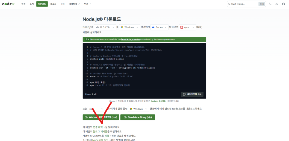 학습용으로 Node.js를 사용하려면 안전성이 검증된 LTS 버전을 설치하라고 하네