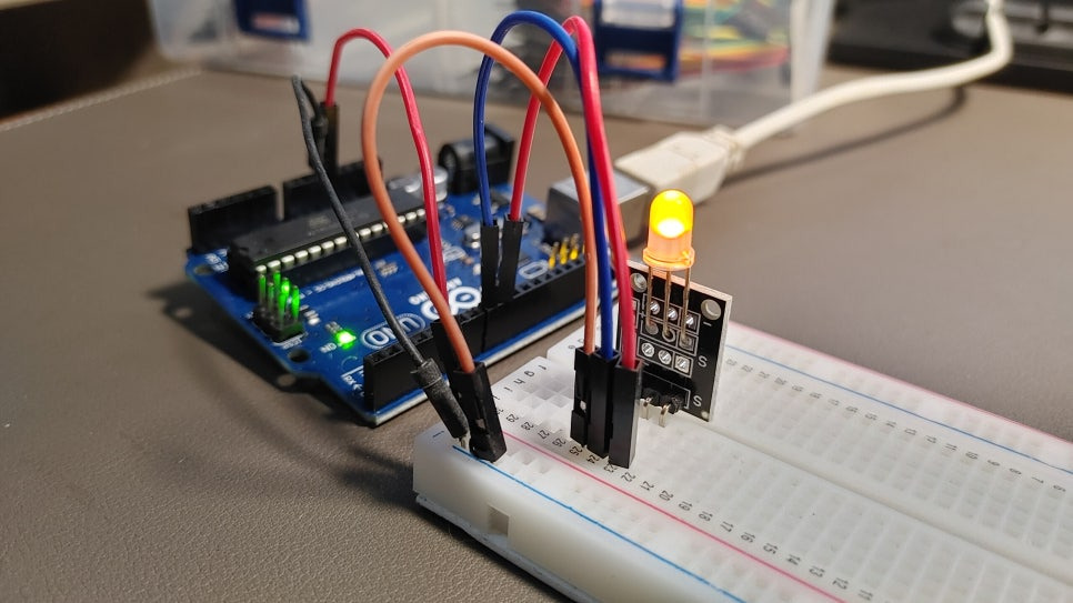 단일 LED를 연결할 때, 저항은 +쪽(긴 다리)에 연결하든 -쪽(짧은 다리)에 연결하든 직렬이기만 하면 상관없습니다. 하지만 습관적으로 신호가 들어오는 +쪽에 연결하는 것이 헷갈리지 않고 좋습니다.