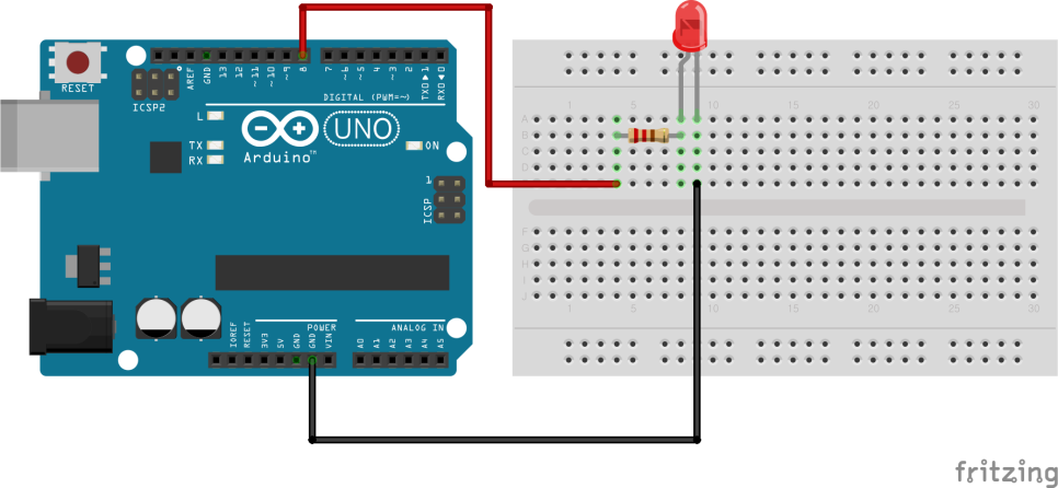 D8 → 저항 → 긴 다리(+) 짧은 다리(-) → GND