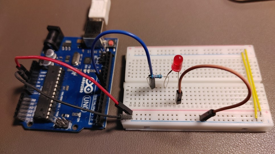 주의사항: LED는 과도한 전류가 흐르면 타버립니다. 반드시 저항(220 ~ 330옴)을 직렬로 연결해 전류를 제한해야 합니다.