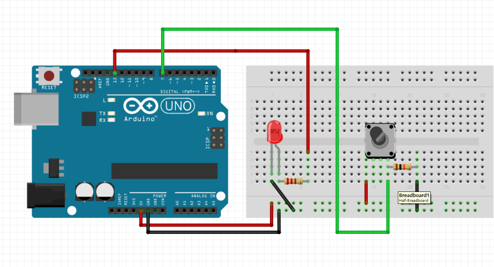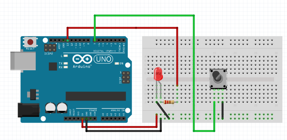 - 신호선 연결 (입력): 버튼의 반대쪽 다리에서 선을 뽑아 아두이노 7번 핀에 연결합니다.