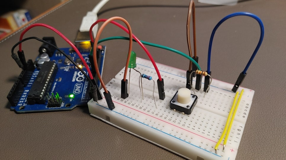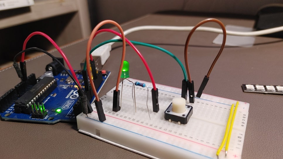 - 전원 연결 (5V): 버튼의 한쪽 다리에 아두이노 5V를 연결합니다.