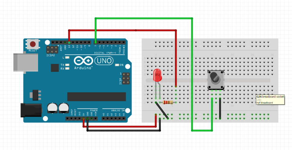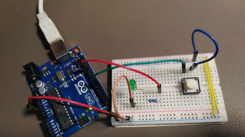 - 신호선 연결 (입력): 버튼의 반대쪽 다리에서 선을 뽑아 아두이노 7번 핀에 연결합니다.