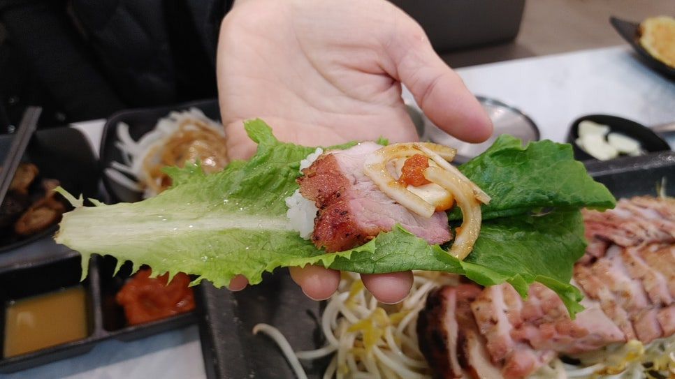 상추쌈 위에 아삭한 숙주와 요돼지 한 점을 올리고,