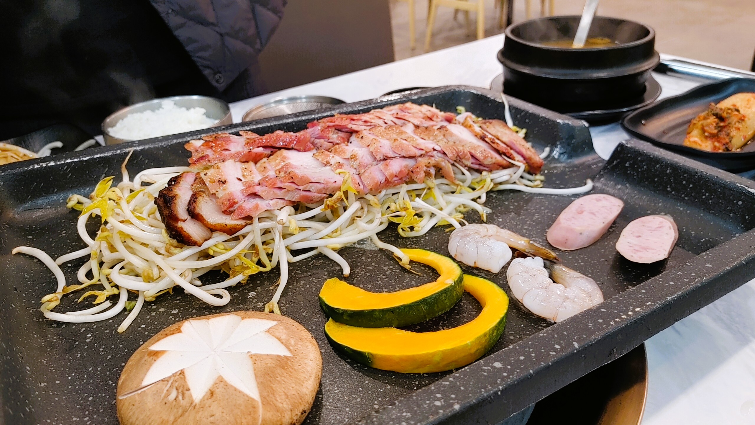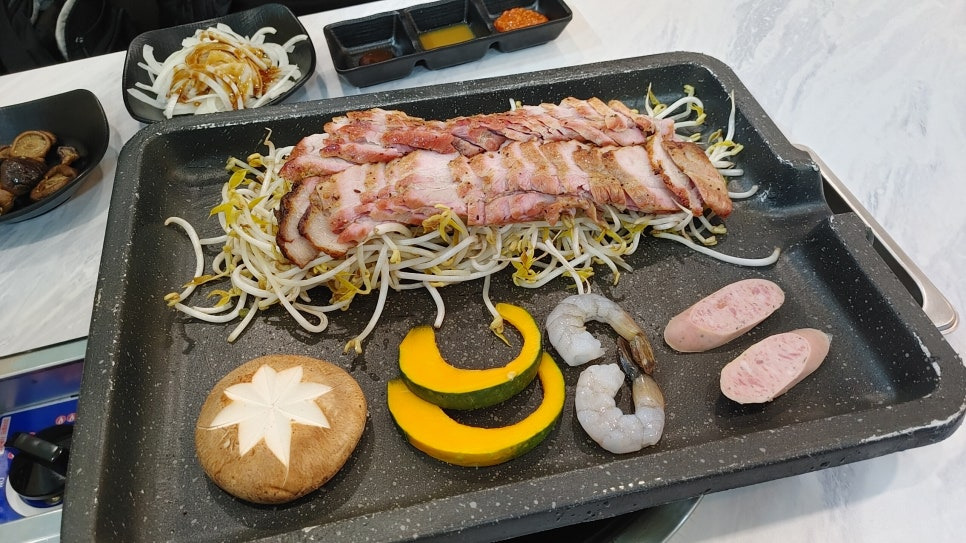 숙주나물 위에 두툼한 고기, 큼직한 표고버섯, 단호박, 새우, 소시지까지 한상 가득 차려져 나옵니다.
