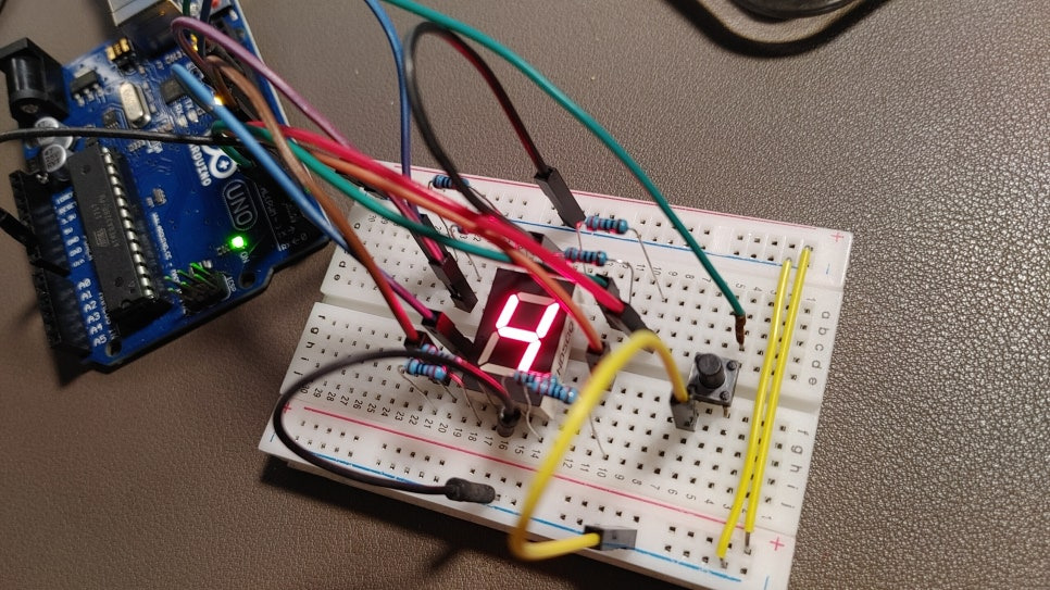 아두이노의 디지털 핀 7~8개를 사용하여 각 세그먼트를 `digitalWrite()`로 제어합니다.
