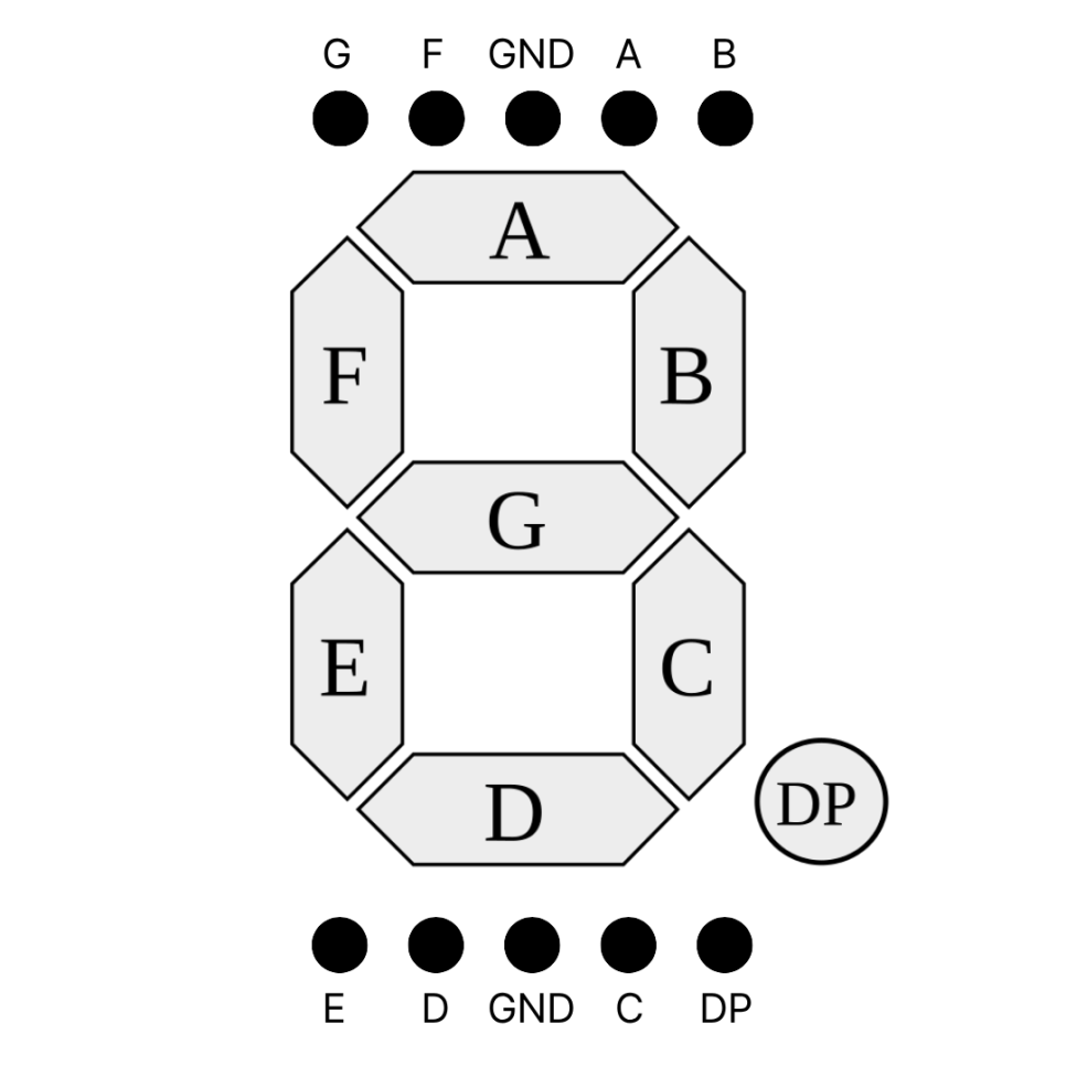 7세그먼트는 이름 그대로 7개의 막대 모양 LED(세그먼트)를 '8'자 형태로 배열하여 숫자(0~9)와 일부 알파벳을 표시하는 장치입니다. 실제로는 소수점을 표시하는 점(DP, Decimal Point)을 포함해 총 8개의 LED가 들어 있습니다.
