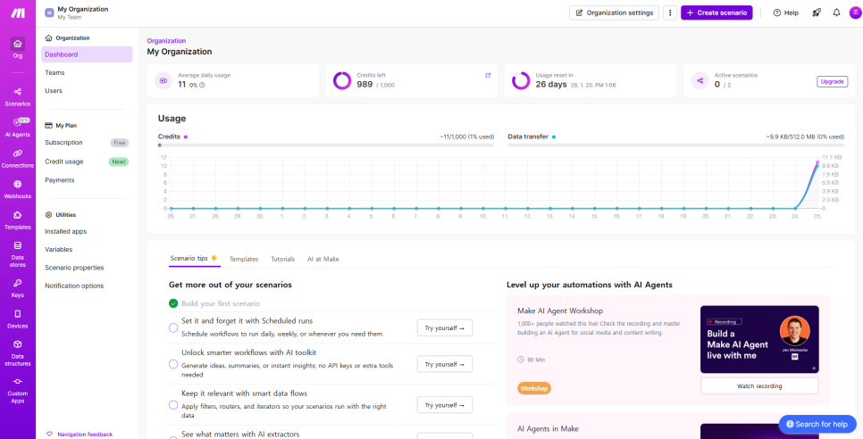 Operation: 시나리오 내에서 모듈 하나가 한 번 실행되는 단위입니다. (2025년 현재는 통합된 Credit 체계로 관리됩니다.)