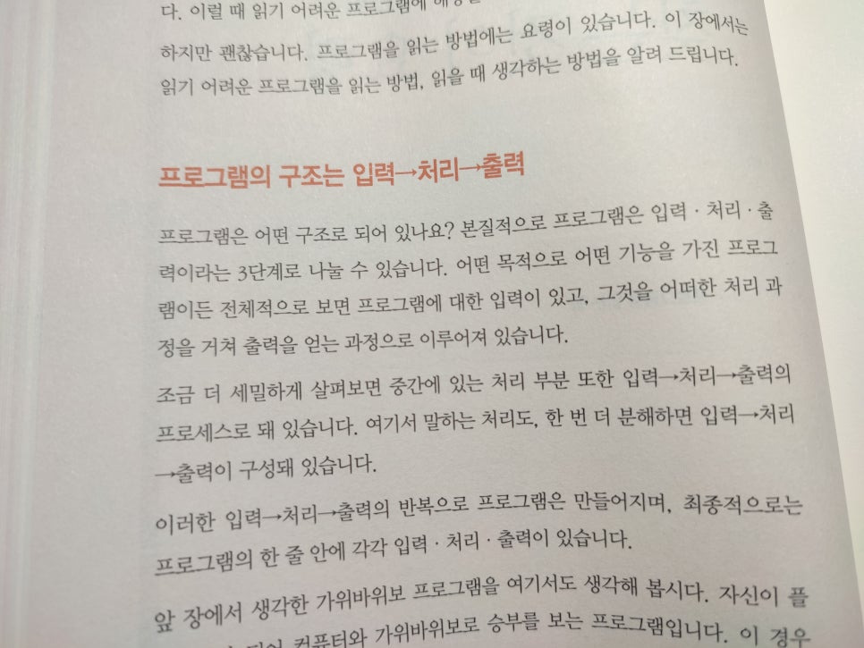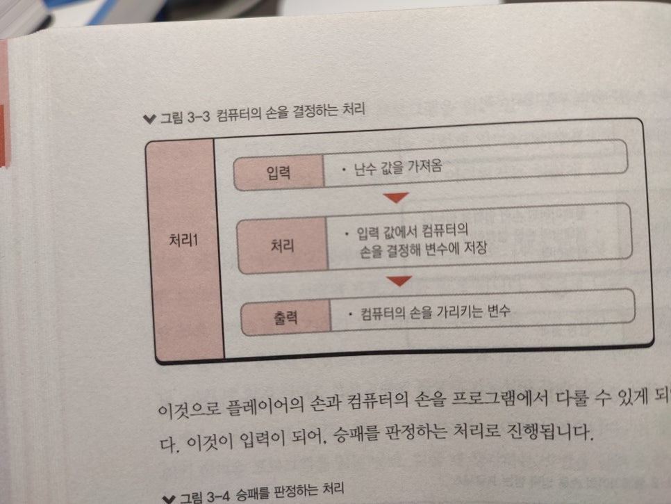 가위바위보 게임을 예로 들어, 사용자의 입력을 받고(Input), 승패를 판정하여(Process), 결과를 보여주는(Output) 과정을 시각화하며 설명해주어 초보자도 쉽게 이해할 수 있습니다.