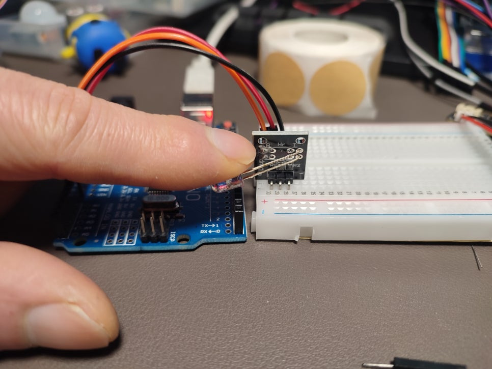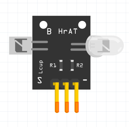 이 센서에는 적외선 LED와 광트랜지스터가 달려 있습니다. 손가락을 대면 심장이 뛸 때마다 손가락 끝의 혈류량이 변하는데, 이때 적외선이 투과되거나 반사되는 양이 달라지는 것을 감지해 심박 신호를 만들어냅니다.