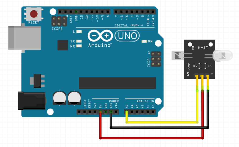 [미션] 내 심장 박동과 동기화하기 (Visual & Audio Alarm) 단순히 화면으로 그래프만 보는 것이 아니라, 내 심장이 뛸 때마다 2색 LED(KY-011)가 반짝이고 능동 부저(KY-012)가 "삑-" 소리를 내는 '휴대용 심박 측정기'를 만들어 보세요!