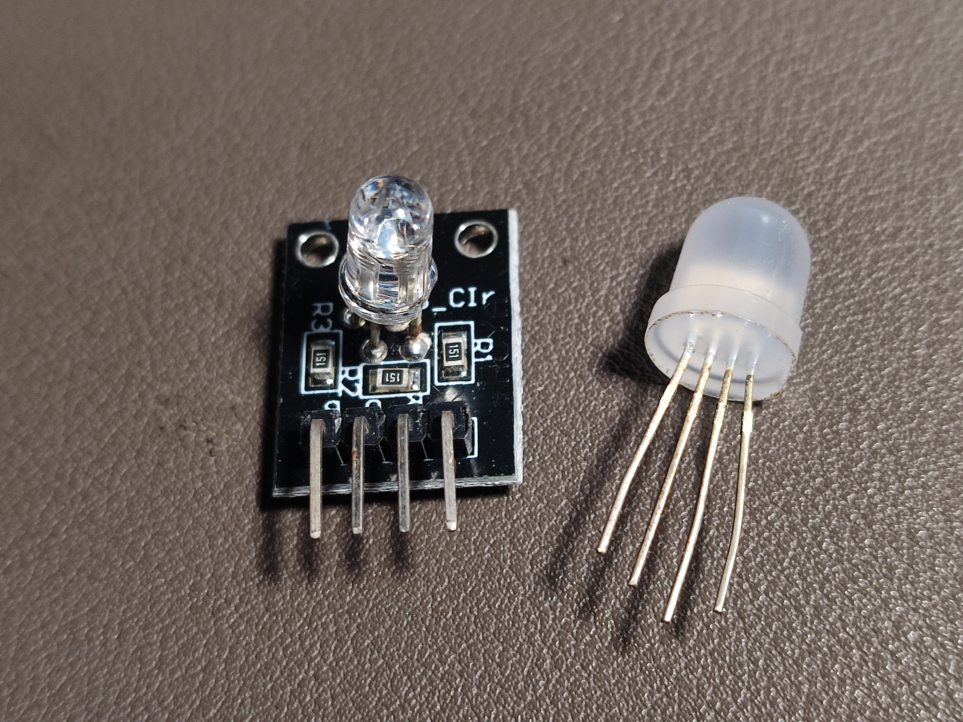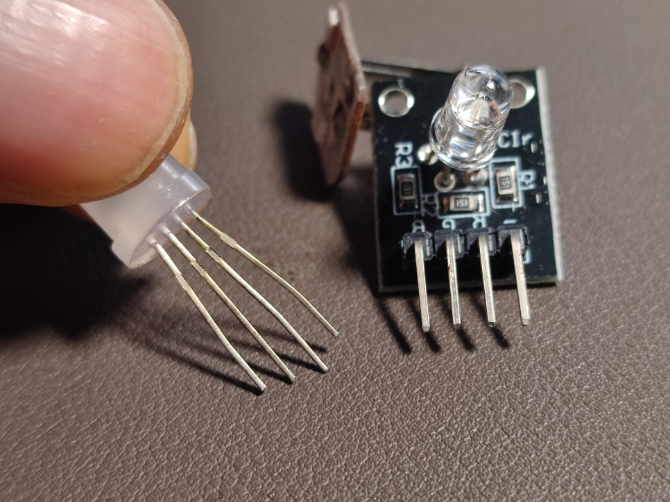 KY-016은 핀이 4개입니다. 각 색상을 제어하기 위해 3개의 디지털 핀(PWM 지원 핀 권장)을 사용합니다.