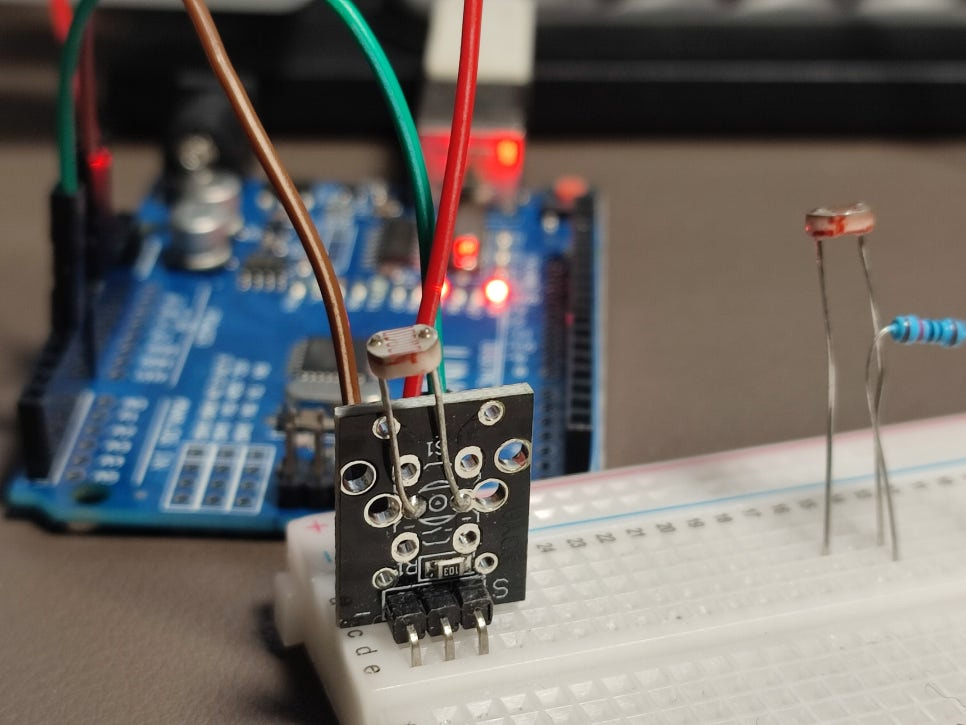 - 작동 원리: 주변이 밝으면 저항값이 낮아지고, 어두우면 저항값이 높아지는 성질을 가졌습니다. 아두이노는 이 저항의 변화를 아날로그 전압 값(0~1023)으로 읽어들입니다.