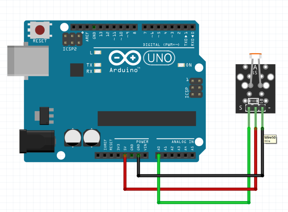 KY-018은 밝기의 정도를 읽어야 하므로 아두이노의 아날로그 핀(A0)에 연결합니다.