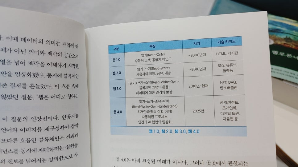 이 책은 웹 4.0을 'AI와 블록체인이 결합하여 새로운 디지털 경제 생태계를 만드는 시대'로 정의합니다.