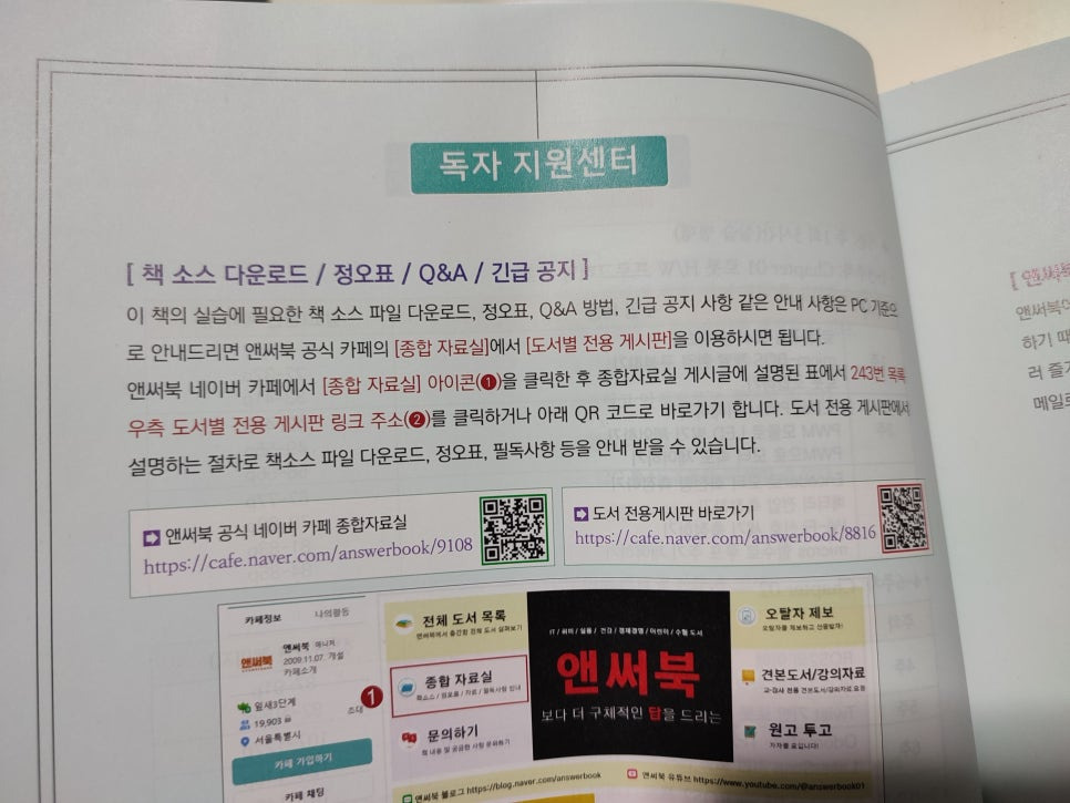 필요하신 경우 다양한 도서에 대한 체험단도 진행하기 때문에 관심있으신 분들은 네이버에서 앤써북을 검색해 보시면 네이버 카페를 찾으실 수 있습니다.
